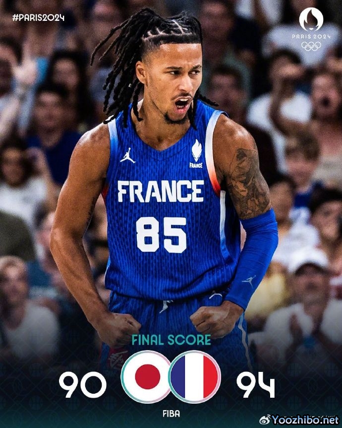 奥运男篮小组赛B组,法国对阵日本。一开场,双方很快陷入缠斗,比分始终紧咬,法国不断冲击篮筐拿分,日本连中三分还以颜色,亚布塞莱连中三分,日本内外开花一波8-0一度反超比分,法国及时回暖完成9-2的小高潮,半场战罢法国49-44领先5分。下半场,日本率先发力打出8-2反超比分,此后双方展开拉锯战,比分交替领先,法国一波7-0占据主动,末节八村塁累计违体犯规被驱逐,河村勇辉3+1连得6分带队反超,双方争夺陷入白热化,戈贝尔误伤巴图姆导致后者嘴里出血,关键时刻富尼耶三分扳平比分,河村永辉4罚全中后斯特拉泽尔3+1再度抹平分差,河村永辉超远三分绝杀不中,双方进入加时。加时赛,文班亚马统治攻防两端,个人连得8分,日本连中三分但依旧无力回天。最终,法国加时94-90力克日本。