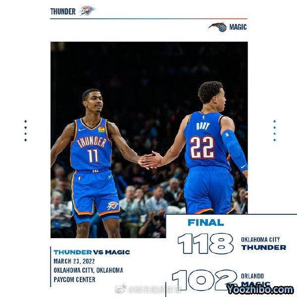 直播车 3月24日讯 NBA常规赛雷霆对阵魔术,雷霆近来遭遇10连败,魔术则是取得2连胜。开场后魔术外线开张早早建立两位数领先,雷霆逐渐找到进攻节奏,但魔术外线手感火热。第二节上来风云突变,雷霆一波20-2的攻势一举完成反超,此后魔术在小安东尼的带领下稳住阵脚咬住比分,上半场雷霆60-53领先。下半场回来虽然魔术在第三节一度追平比分,但雷霆及时找回状态再度建立优势,最终雷霆118-102击败魔术结束10连败。