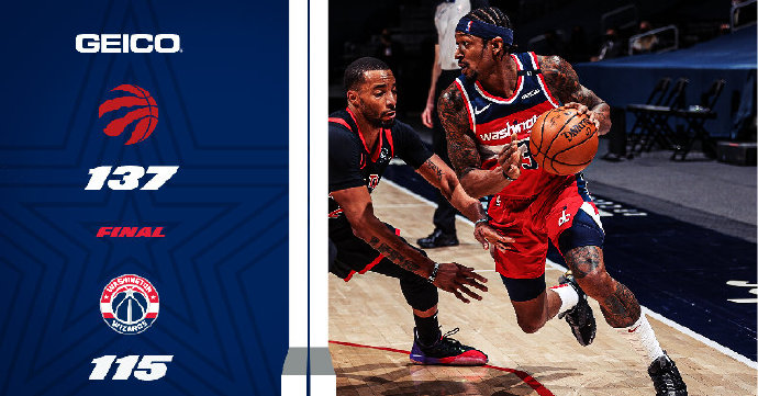 直播车2月11日讯 NBA常规赛,奇才今日坐镇主场迎战猛龙,猛龙上场比赛第四节逆转战胜灰熊,奇才上场也险胜公牛,本场比赛威斯布鲁克回归。比赛开局阶段,猛龙全队三分手感火热连续投进,建立优势,奇才外线失准只能内线强打或找寻突破机会得分苦苦支撑,首节结束猛龙领先12分。第二节小洛佩兹成为奇兵,内线连续打成帮奇才追近比分,猛龙在西亚卡姆、洛瑞的带领下半场结束依然保持13分的领先优势。下半场,奇才追分势头迅猛,比尔、阿夫迪亚联手打出8-0小高潮,猛龙依靠三分手感依然保持双位数领先,末节纳斯关键挑战成功,鲍威尔屡屡建功,猛龙一波11-0杀死比赛,最终猛龙137-115轻取奇才,拿到连胜。