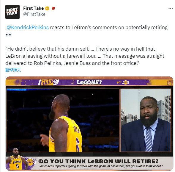 名嘴帕金斯在《First Take》节目中谈到詹姆斯可能退役的传闻,表示:勒布朗都不会相信自己说的鬼话。他不进行告别巡演是不会退役的。这个消息会直接传递给珍妮-巴斯、佩林卡和湖人高层。