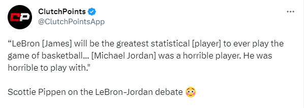皮蓬还公开表示:詹姆斯将成为NBA史上最伟大的球员,在我加盟公牛前,你们都看到乔丹打球,他一个糟糕的球员,一个糟糕的队友。