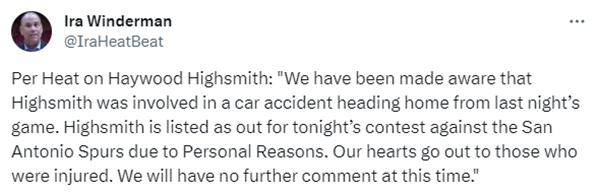 热火官方未透露车祸细节以及具体受伤人员,随后据热火跟队记者Ira Winderman报道,海史密斯并未受伤,但车祸中有其他人受伤。