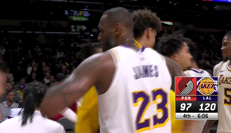 下半场,湖人第三节继续压制开拓者并且一度领先到20分,之后布罗格登助开拓者缩小分差,三节打完湖人领先16分,期间老詹打成不讲理2+1,被拉拽仍旧把球打进;詹姆斯快攻时,手臂被亨德森的指甲划出三道血印子,裁判没有吹罚犯规,老詹站在场边接受止血治疗。