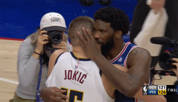 比赛结束之后,约基奇和恩比德拥抱,随后两人捂着嘴耳语交流一番,恩比德成功把约基奇逗笑了,两人虽然在赛场上、奖项评选上是直接的竞争对手,但场外的关系还是很好的。恩比德近两场面对约基奇场均砍44分12.5板7.5助,表现出色。