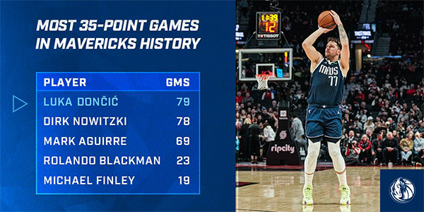 1、东契奇独行侠生涯已经有79场比赛砍下35+,超越诺维茨基独占队史第一