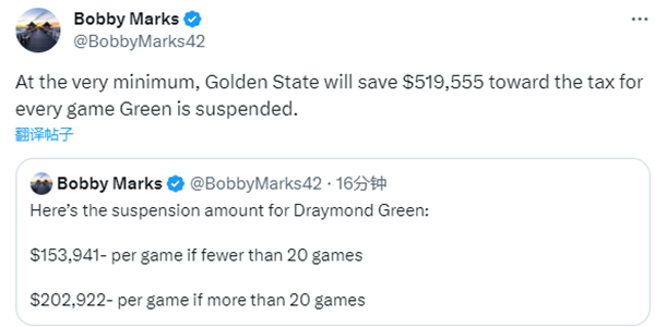 薪资专家Bobby Marks表示,如果追梦禁赛场次少于20场,他每场将被罚款153,941美元;若追梦禁赛场次超20场,他每场将损失202,922美元;与此同时,追梦每被禁赛一场,勇士最少能够节省51.955万美元奢侈税。
