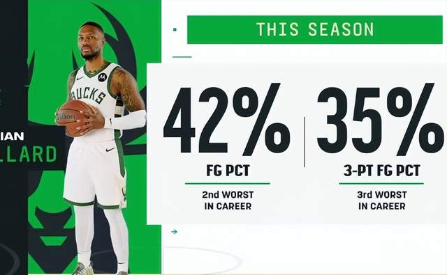 本赛季,利拉德场均登场35.6分钟,得到25分7助攻4.6篮板。数据虽然相比上赛季有着较大下滑,但毕竟他身边多出了一位超级巨星。不过令人感到吃惊的是,在字母哥身边利拉德的效率竟然也有大幅度的下滑。本赛季42%的投篮命中率和35%的三分命中率,是21-22赛季之外的生涯最低和第二低,而那个赛季利拉德只打了29场,开拓者也在摆烂。