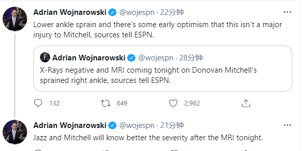 第三节,米切尔在一次抢球落地时,不幸扭伤脚踝,随后米切尔坐在地板上,起身之后十分痛苦,抱住队友罗伊斯-奥尼尔,右脚已经无法用力,缓了一会后,米切尔一瘸一拐,被两人搀扶离场;伤情初步确诊为右脚踝扭伤,没有出现骨折的情况,ESPN名记沃纳罗斯基还透露爵士内部相信米切尔脚踝伤势不是太严重。