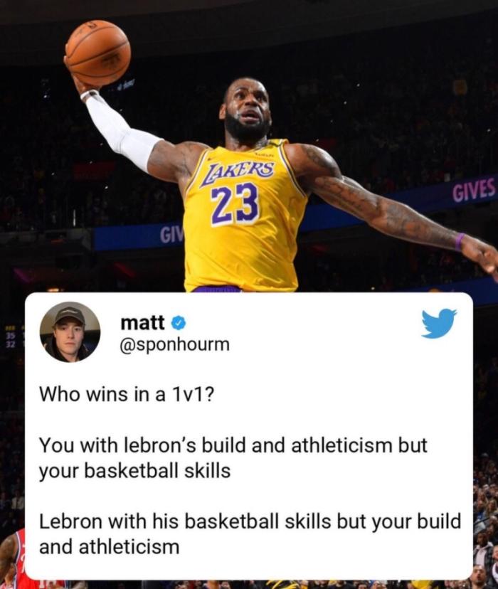 需要明确的一点就是詹姆斯不仅仅是一个依靠身体打球的球员,他还有着历史前几的球商,他可以观察到赛场上每个队友的跑位,这一点就是我们这些普通人无法媲美的东西。因此就算詹姆斯只是拥有我们这种普通人的身体,那么他还是可以依靠强大的球商成为一个合格的后卫,至少他还可以维持高助攻。就算他没办法像以往那样突破到篮下,他还是会有不错的表现。