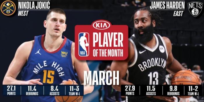 直播车讯北京时间4月2日,NBA官方公布三月月最佳球员,最终掘金的约基奇和哈登当选,带队的战绩以及个人数据都无可挑剔!
