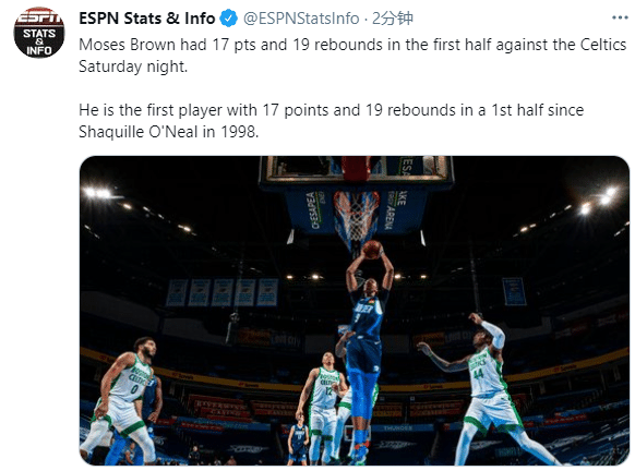 第三、摩西-布朗上半场6中6轰下17分19篮板,比肩奥尼尔成为1998年之后第一位半场17+19的球员,NBA近23年第一人。