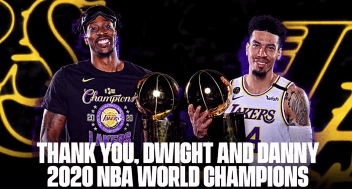 斯台普斯球馆特别播放致敬暖心的短片,感谢霍华德和丹尼格林在湖人队留下的美好时光,并颁发上赛季总冠军戒指!不同于丹尼格林已经在第三支球队拿下总冠军了,这是魔兽霍华德的首冠,终于圆梦了。