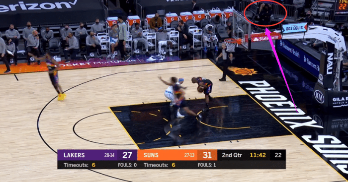 第二节开打没多久,镜头给到詹姆斯,当时浓眉站在詹姆斯身边探讨战术,老詹双眼紧盯着平板,十分认真;不过詹姆斯很低调,穿着一套黑色衣服,戴着黑色口罩,还戴着黑色卫衣的帽子;右脚上穿着保护靴,上一场比赛,詹姆斯的右脚踝被所罗门-希尔撞伤,归期未定。