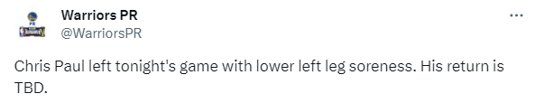 直播车11月29日讯 ,NBA季中赛收官日伤病不断,拉文德罗赞以及康诺顿伤退,在勇士对阵国王比赛中,38岁的保罗不幸遭遇伤病,因伤突然一瘸一拐返回更衣室,勇士官方宣布,保罗左小腿酸痛,本场比赛回归待定。