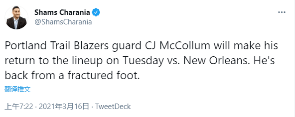 目前开拓者已经官宣喜讯,官方发推写道:CJ-麦科勒姆回来了!