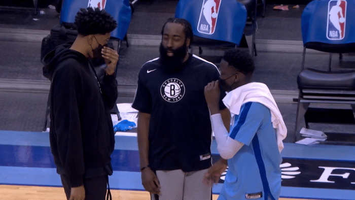 赛后哈登主动跑到火箭替补席,先是拥抱火箭助教,中途遇到沃尔,两人紧紧拥抱相互致敬;然后哈登用拥抱多位前队友,泰特、琼斯等人都来昔日老大哥拥抱;紧接着哈登找到塔克,两人有说有笑十分亲密,哈登还摸了摸塔克的脑袋,这两兄弟之间的关系太好了,杰夫-格林也过来和塔克打招呼。