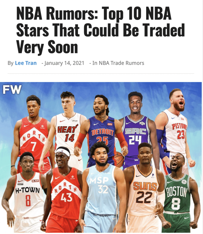 直播车讯 北京时间1月25日,美国记者Lee Tran预测了交易截止日前可能被交易的NBA球星,本赛季的交易截止日是当地时间3月25日,让我们来看看!
