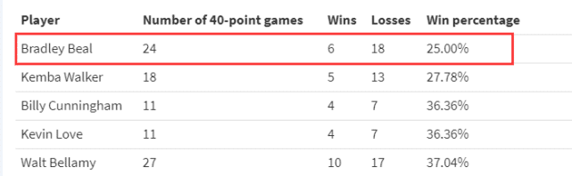 直播车1月11日讯 轰下40+的分数,球队却赢不了球,这显然是一件令人扎心的事。本赛季至今,奇才球星比尔两次得分突破40分,球队却都输了比赛,把上赛季也算上的话,近两年,比尔有12场比赛得分40+,奇才竟然输了其中11场。近日,美媒HoopsHype公布了一份历史球星40+得分的胜率排行榜,比尔排名倒数第一。