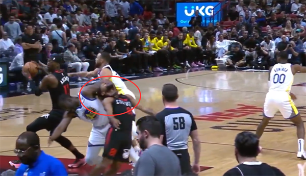 第一节9分44秒,追梦格林和米尔斯激烈卡位,阿德巴约抛投得分,裁判响哨,回放后裁判吹罚追梦格林卡位犯规在先,阿德巴约进球无效;从慢镜头可以看出,追梦有一个相当恶劣的脏动作,锁喉放倒了米尔斯,不过裁判并未升级为恶意犯规,仅仅吹罚普通犯规。