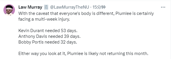 Law Murray列出了其他球员遭遇相似伤情后的缺席场次——杜兰特53天、安东尼-戴维斯39天、波蒂斯32天,还写道:需要注意的是,每个人的身体条件都不同,但普拉姆利肯定将缺席数周,无论如何,这个月可能都看不到他出场了。