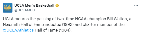 比尔-沃顿的母校加州大学洛杉矶分校(UCLA)男篮官推写道:向两届NCAA总冠军比尔-沃顿的去世表示哀悼,他是奈史密斯名人堂成员,也是加州大学洛杉矶分校的篮球名人堂成员。