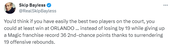 名嘴Skip发推吐槽:如果你拥有场上最好的两名球员,你至少可以在奥兰多赢球。你让魔术抢了19个进攻篮板,这可是人家的队史纪录,然后二次失分达到了36分,最终导致湖人输了19分。