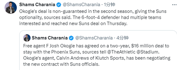 据报道,奥科吉在自由球员市场上引起多支球队的兴趣,太阳一直想要与其续约,最终他在今天和太阳达成续约协议,合同第二年非保障,这给了太阳选择权。