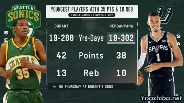 文班打出生涯之夜,一战狂刷多项历史纪录,据统计,文班19岁302天单场砍下至少35分10板,仅次于杜兰特成为史上第二年轻达成如此纪录的球员。