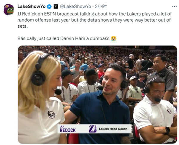 雷迪克暗讽湖人上任主教练哈姆没有战术,湖人媒体LakeShow转发采访并表示:他基本上就是在说哈姆愚蠢。