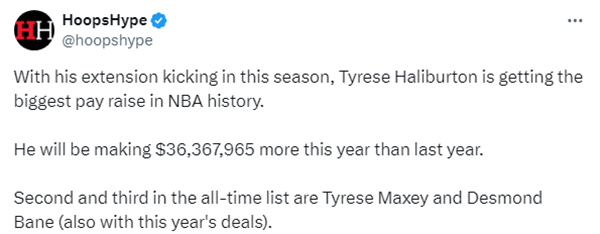 与上赛季相比,哈利伯顿的年薪暴涨3637万美元,这是NBA历史球员在两个赛季之间薪资涨幅最大的一次,这份榜单二三位分别是马克西(3081万美元)和贝恩(3016万美元)。