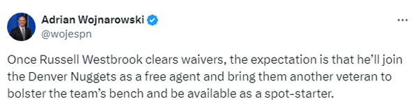 如今威少被快船交易到爵士,预计他将再与爵士达成买断,然后加盟掘金辅佐约基奇和穆雷冲击总冠军。