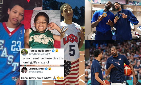 直播车讯 北京时间8月14日,与童年偶像一起夺得奥运金牌是什么感受?步行者球星哈利伯顿更新社交媒体,晒儿时身穿詹姆斯球衣和杜兰特球衣的照片,老詹本人回应:兄弟,太疯狂了。