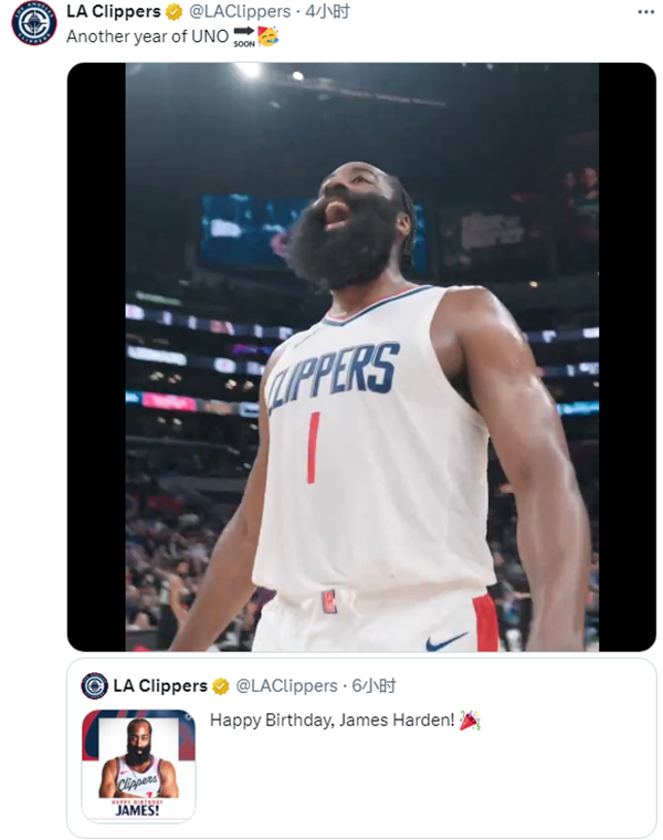 NBA官方、快船官方都发推晒照祝贺哈登35岁生日快乐。