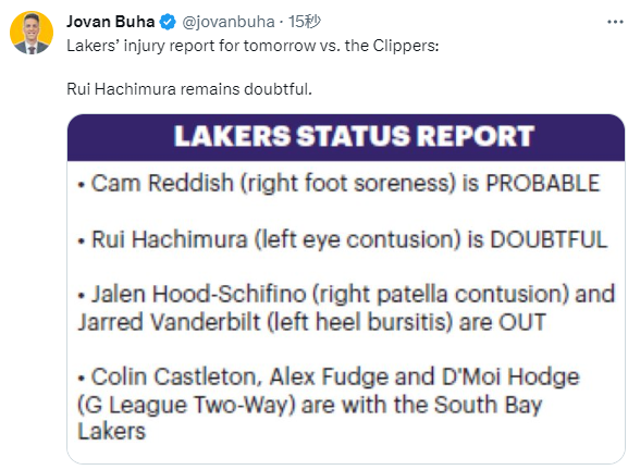 湖人对阵快船,范德比尔特、席菲诺等6名球员确定缺席,八村垒仅仅只有25%的出战概率,在此前对阵国王的比赛中,八村垒的眼睛被抓伤,因伤缺席上一场与魔术的比赛,哈姆透露八村垒因眼伤难以入睡,对光十分敏感;目前来看,八村垒大概率缺战快船。