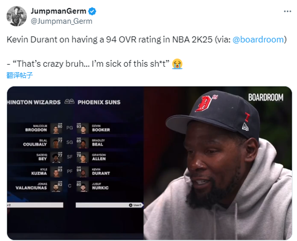 在节目中谈到2K25能力值前十,杜兰特先后说出东契奇和约基奇的名字,问到亚历山大能力值为96时,杜兰特表示:我的能力值只有94?这疯狂了,兄弟,我真的受够了这种事,这事我得找个人的麻烦了。