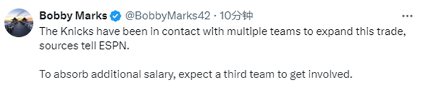 Bobby Marks还透露,由于两支球队土豪线的限制,该交易的细节仍然在协商中;目前,尼克斯薪资总额处在第二土豪线下760万美元,而在这次交易中森林狼无法拿回更多的钱。