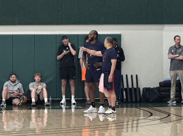 小卡身穿快船队训练服来到训练场,先是与球队的理疗人员聊了几句,之后与坐在场边休息的PJ-塔克、巴图姆等人击掌,并且与塔克开怀热聊;小卡还在球场上与泰伦-卢交流,小卡咧嘴大笑,心情很不错。