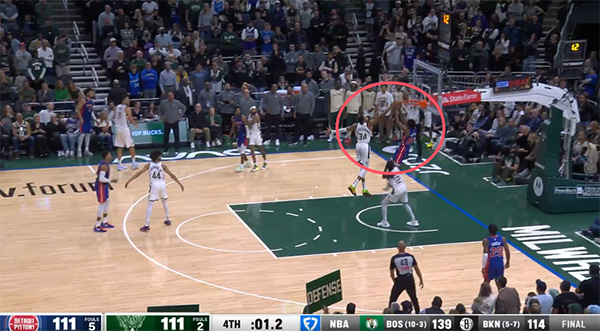 在常规时间最后1.2秒,字母哥盖帽罗恩-霍兰,裁判吹罚犯规,当时字母哥一脸无辜的表情,霍兰两罚不中进入加时;裁判报告指出,字母哥的盖帽很干净,随后的身体接触被视为偶然的,因此这是一个错判。