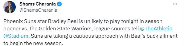 过去几年,比尔一直因伤病而长期缺席比赛,希望这一次,比尔的背伤不要太严重。对于比尔的情况,名记Keith Smith表示:这对比尔来说只是一场比赛(到目前为止),但这是太阳队的担忧。球队的阵容本来就头重脚轻,三位球星(加上一些角色球员)都在与伤病作斗争。