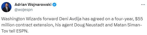 直播车10月23日讯 ,据ESPN名记woj报道,奇才与前锋德尼-阿夫迪亚已经达成一份4年5500万的提前续约合同,合同全额保障。