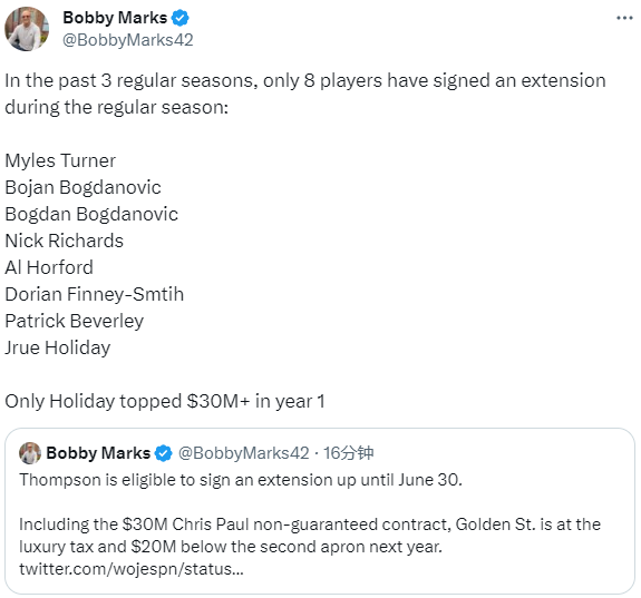 NBA薪资专家Bobby Marks表示汤普森提前续约的截止日是在明年的6月30日,包括保罗不受保障的3000万美元,勇士明年将缴纳高昂的奢侈税,而且比第二土豪线少2000万美元。