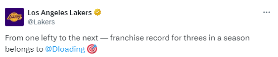 湖人官媒写道:从一个左撇子到另一个左撇子,单赛季三分队史纪录属于拉塞尔。