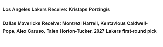 直播车3月9日讯 距离交易截止日只有两周多的时间,湖人是否应该通过交易补强阵容?北京时间3月9日,美媒Fadeaway World(下称FW)建议湖人和独行侠商讨交易,追逐独行侠的内线波尔津吉斯,并列出了一份5换1的交易方案。有球迷认为,这笔方案太坑,湖人能否因此补强不确定,他们甚至可能面对更大的隐患。