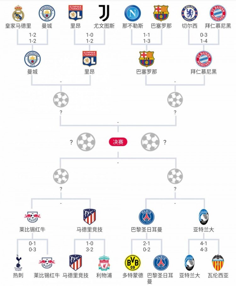 巴萨与拜仁之间的胜者,将对阵曼城与里昂的胜者。