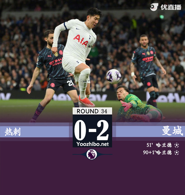 直播车讯 北京时间5月15日英超第34轮补赛,热刺主场对阵曼城。上半场,埃德森、维卡里奥均贡献关键扑救。易边再战,德布劳内助攻哈兰德破门,埃德森、德布劳内伤退,奥尔特加化解孙兴慜单刀,多库造点哈兰德点射完成双响。最终热刺0-2曼城。积分榜方面,曼城2分优势领先阿森纳居榜首,热刺63分无缘前四。