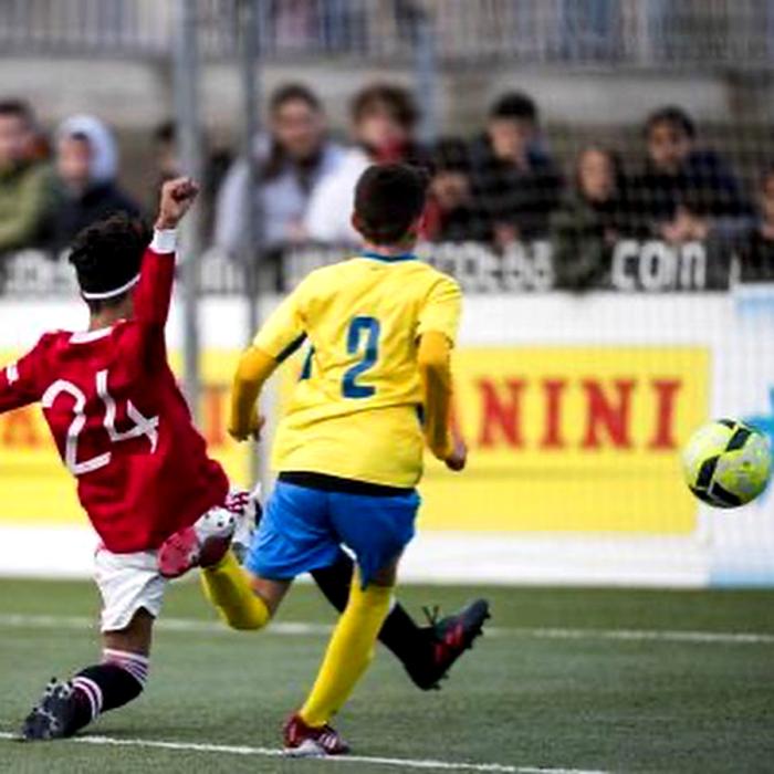 直播车04月14日讯 C罗长子迷你罗已经加入曼联青训体系将近一个赛季,也为12岁以下少年队进了不少球。不过,本周他得分的画面才第一次被人们看到,在曼联少年队大胜EF吉罗内斯沙巴顶的比赛中,迷你罗接应队友的左路任意球,门前机敏抢点铲射得分,将场上比分改写为5-0。