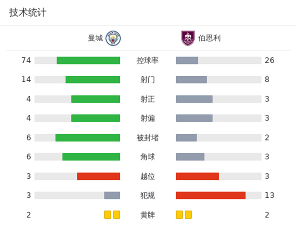 最终全场比赛结束,曼城3-1伯恩利。