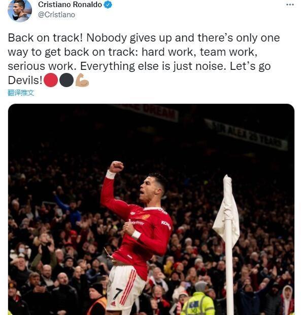 C罗写道:“重回正轨!没有人放弃,重回正轨只有一个方法,那就是努力工作,团队协作,认真工作!其他的一切都只是噪音,冲吧,红魔!”