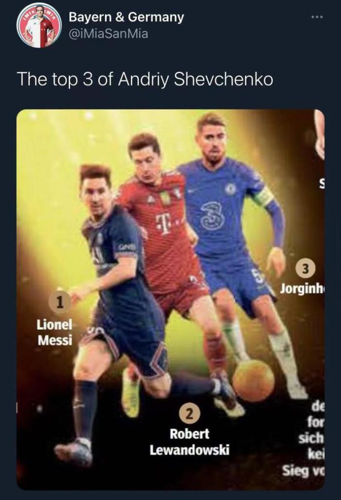 舍甫琴科:1、梅西,2、莱万,3、若日尼奥