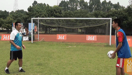 如果向右边的,身体就先往左,然后用右前额把球敲击回去